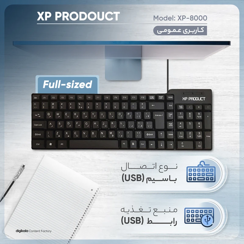 کیبورد ایکسپی-پروداکت مدل XP-8000، یک گزینه اقتصادی و کاربردی است که برای کاربری عمومی و روزمره طراحی شده است. ترکیب خوانایی بالا، تایپ نرم و ساختار ساده این محصول را به انتخابی مناسب برای محیط منزل و محیطهای اداری تبدیل کرده است.