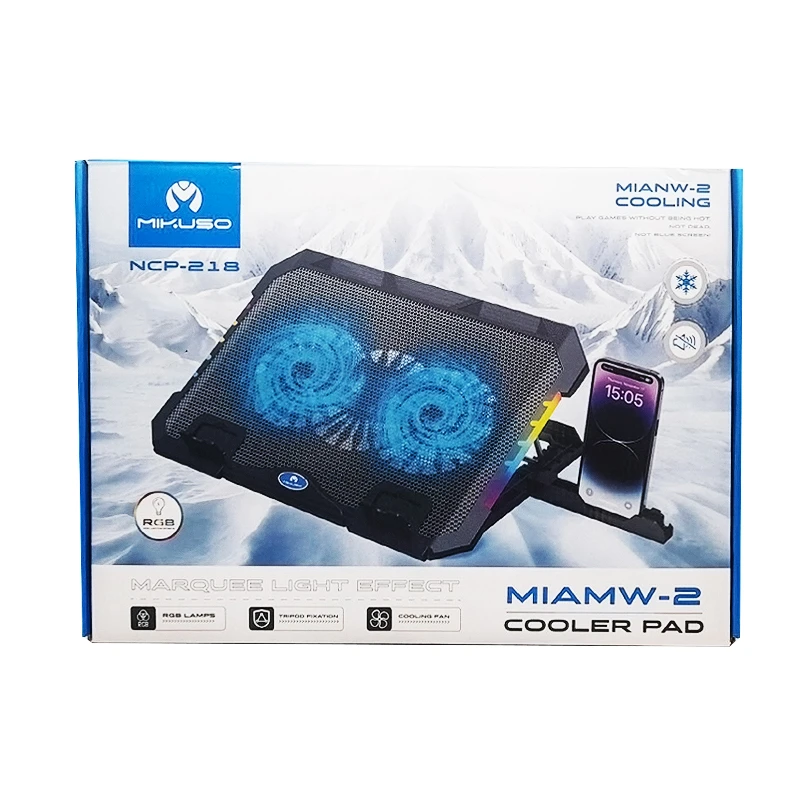 این کول پد مجهز به دو عدد فن 120 میلیمتری بوده و دارای نورپردازی رنگ آبی می باشند. موتور فن ها بسیار کم مصرف و کم صدا می باشند. امکان تنظیم سرعت چرخش فن با استفاده از کلید تعبیه شده در پشت محصول وجود دارد. جنس بدنه این کول پد ترکیبی از پلاستیک مرغوب و فلز می باشد. منبع تغذیه این محصول از طریق درگاه یو اس بی صورت می گیرد. این محصول مجهز به دو عدد درگاه USB بوده که از یکی برای تامین انرژی و دیگری برای اتصال انواع دستگاه ها مثل فلش مموری، موس و غیره به کار می رود. در قسمت های کناری این پایه خنک کننده نورپردازی RGB به صورت ساید قرار دارد که شما می توانید با استفاده از کلید تعبیه شده نحوه نورپردازی و افکت های نوری را تغییر دهید. این محصول دارای استند موبایل نیز می باشد که در صورت نیاز می توانید استند موبایل را به کول پد متصل یا از آن جدا نمایید. این محصول مجهز به پایه های تنظیم ارتفاع در پنج سطح می باشد که شما می توانید مطابق نیاز خود آن را تنظیم کنید. همچنین مجهز به پایه های ضد لغزش لپ تاپ می باشد.