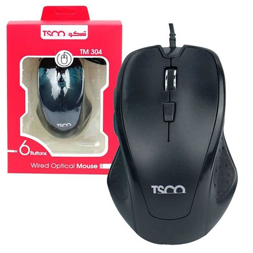 ماوس سیم دار TSCO مدل TM304اتصال با سیم از طریق رابط USB با کابل 180 سانتی متری و روکش TPEبدنه ساخته شده از جنس پلاستیک ABS مقاوم در برابر فشار و ضربه شامل 6 عدد کلید فیزیکیسنسور از نوع اپتیکال با میزان دقت متغیر بین 800، 1200، 1600، 2400 نقطه در اینچ و دارای کلید DPI جهت تغییر میزان دقت موس